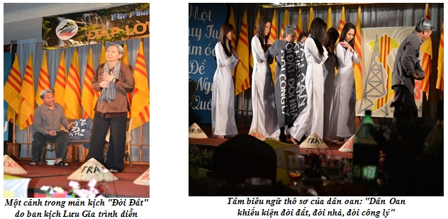 Tiếp tục chương trình, ban kịch nghệ Lưu Gia đã làm cho tất cả những quan khách tham dự phải rơi nước mắt khi các diễn viên Lưu Thành Phú và Bạch Vân trình diễn vở kịch “Đòi Đất”. Màn kịch nói lên tình trạng dân oan khiếu kiện trong nước đi đòi lại mảnh đất của cha ông để lại, nay bị chính quyền tước đoạt bằng cách thu mua rẻ mạt hoặc cướp trắng tay. Điều trớ trêu là bà dân oan lại là một người xuất thân từ một gia đình có công với cách mạng. Tuy vậy, bọn công an tàn nhẫn đã không kiêng nễ và trái lại, còn đánh đập bà một cách dã man, tàn bạo khi bà lụ khụ đi biểu tình đòi lại căn nhà sập xệ mà bà đang trú thân qua ngày. Bà đã quá uất ức, trăn trối và rồi hít vô nhịp thở cuối cùng trước khi lìa đời. Nghệ thuật diễn xuất của ban kịch Lưu Gia thật là tài tình và chuyên nghiệp, khiến cho người xem chú tâm theo dõi từ đầu cho đến cuối. Màn kịch được các em trong ban vũ Lưu Gia mặc áo dài trắng múa phụ họa để nói lên cảnh oan trái của người dân bị chính quyền hà hiếp, bóc lột.