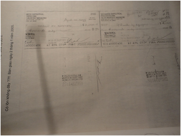 Ông Thái Quang Ty, phó chủ tịch xác nhận: “sổ sách và tiền bạc của khu hội, chỉ một tay NKT nắm giữ” vì vậy NKT mới có quyền trả 13 tháng tiền, cho người layout báo, vì độc quyền chiếm giữ NKT mới tự lấy check book của khu hội, ký cho chính NKT 2 cái check, mệnh giá $2000 (hai ngàn)