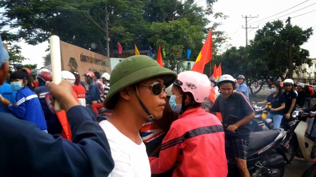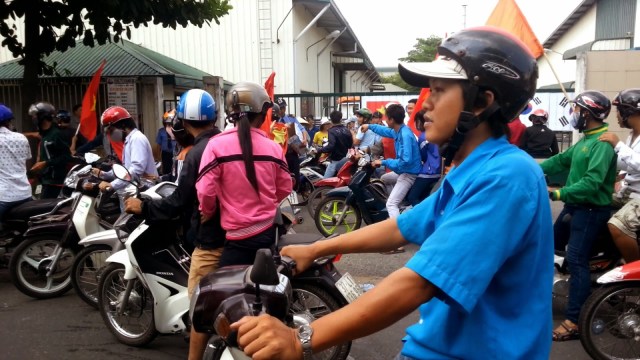 Một đám đông cầm cờ chạy vụt về phía khu công nghiệp Biên Hòa 2. Chúng tôi lại đi theo. Con đường dẫn vào khu công nghiệp này đang vắng, vì chưa đến giờ tan ca 1, cũng như rất ít công ty còn làm việc. Nơi này cũng không an ninh. Phía ngược chiều bên đường, một chiếc xe chạy cầm cờ, người ngồi sau mang ống tuýp nước bằng sắt dài, nhìn rất đáng ngại. Xe này chạy ào ạt vào trong nội khu công nghiệp. Nếu là ngày thường, chắc chắn chiếc xe đó đã bị CSGT chận lại. Nhưng hôm nay thì khác, họ chạy như trên xa lộ tự do.