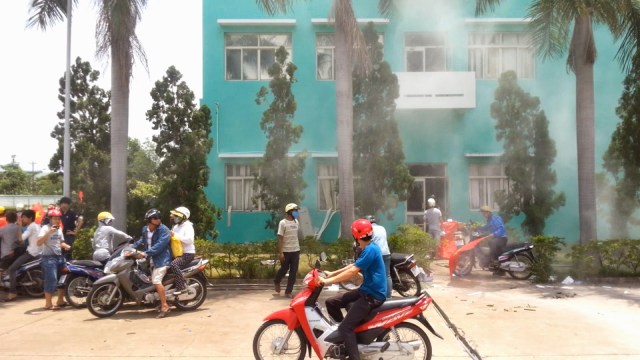 Điều đó được xác định một lần nữa khi chúng tôi chạy đến một công ty Đài Loan khác, theo dấu một làn khói đen ngùn ngụt lên trời, có thể nhìn thấy rõ từ 2,3 cây số. Nơi này không còn rõ tên họ vì bảng hiệu đã bị đập. Chữ làm bằng ximăng và nhôm thì giờ chỉ còn là những mảnh vụn rải rác. Lửa vẫn còn cháy. Một tiểu đội CSCĐ có mặt nhưng đang ngồi nghỉ trong bóng mát, ăn cơm hộp. Không có dấu hiệu nào là xe chữa cháy sẽ đến. Một cô bán nước gần công ty cho biết lửa cháy từ cuộc bạo động lúc 5,6 giờ sáng cho đến giờ, không ai dập cả, toàn bộ ban giám đốc đã đi trốn. Điều lạ là giữa những người bàng quan, có một 1,2 nhân vật ăn mặc không là công nhân đứng gần đó, mặt rất khó chịu khi chúng tôi hỏi thăm và chụp hình. Thậm chí nếu chúng tôi không nhanh chóng rời khỏi nơi đó, có thể sẽ gặp rắc rối.