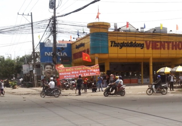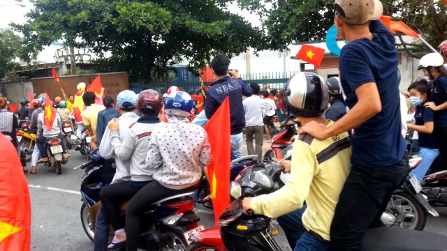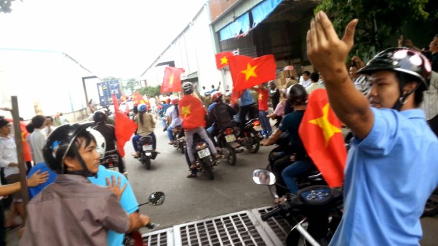 Gần giữa trưa, nắng tháng 5 gắt và khó chịu vô cùng, ai cũng tìm chỗ mát để né. Vậy mà chỉ đi được một đoạn, chúng tôi tìm thấy hàng loạt các xe gắn máy cầm cờ, trống…v.v gầm rú phía trước. Trong các nhóm ào ạt đi như vậy, có đủ nữ lẫn nam. Cứ thỉnh thoảng lại nghe tiếng hô “Việt Nam Muôn Năm”, “Đả đảo Trung Quốc”… như một cách làm hiệu để đoàn không bị lạc hướng. Dự đoán các nhóm này sẽ đi về khu công nghiệp ở Sóng Thần, Bình Dương, nên chúng tôi quyết định bám theo.