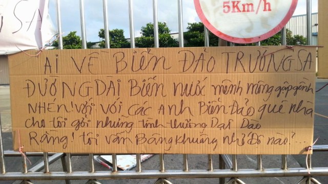 Ở một công ty khác hợp tác làm ăn với Đài Loan, chúng tôi chạy dọc theo đường vào công ty, thấy những tờ giấy “Hoàng Sa – Trường Sa – VN” được dán như một cứu cánh để biện minh cho sự tồn tại của mình. Một cảm giác thật khó tả. Trước đây không lâu, rất nhiều người cầm hay mặc áo có dòng chữ này đã bị bắt, đã bị tù… Nay thì khẩu hiệu đó đang là miễn tử kim bài cho khá nhiều công ty Trung Quốc hay Đài Loan.