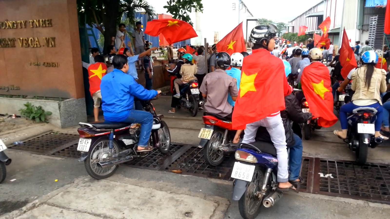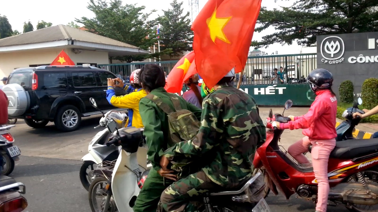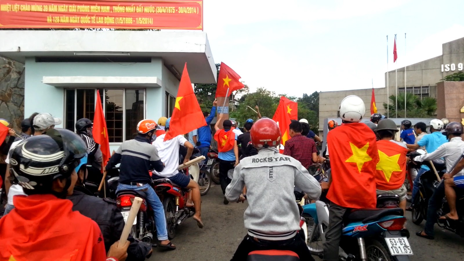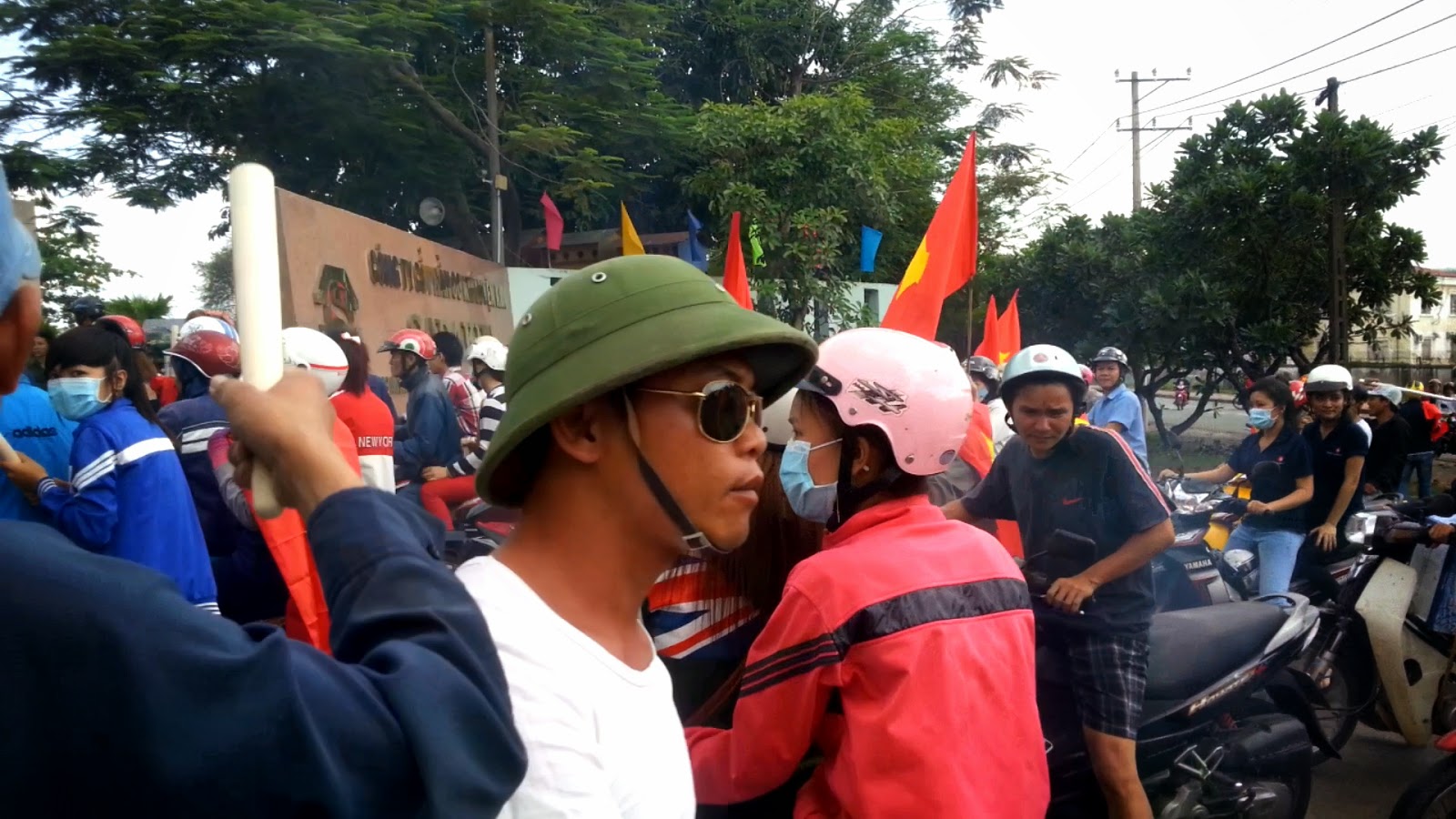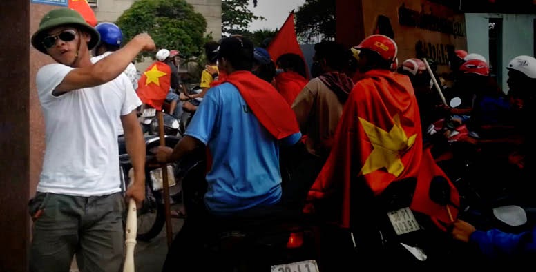 Gần giữa trưa, nắng tháng 5 gắt và khó chịu vô cùng, ai cũng tìm chỗ mát để né. Vậy mà chỉ đi được một đoạn, chúng tôi tìm thấy hàng loạt các xe gắn máy cầm cờ, trống…v.v gầm rú phía trước. Trong các nhóm ào ạt đi như vậy, có đủ nữ lẫn nam. Cứ thỉnh thoảng lại nghe tiếng hô “Việt Nam Muôn Năm”, “Đả đảo Trung Quốc”… như một cách làm hiệu để đoàn không bị lạc hướng. Dự đoán các nhóm này sẽ đi về khu công nghiệp ở Sóng Thần, Bình Dương, nên chúng tôi quyết định bám theo.