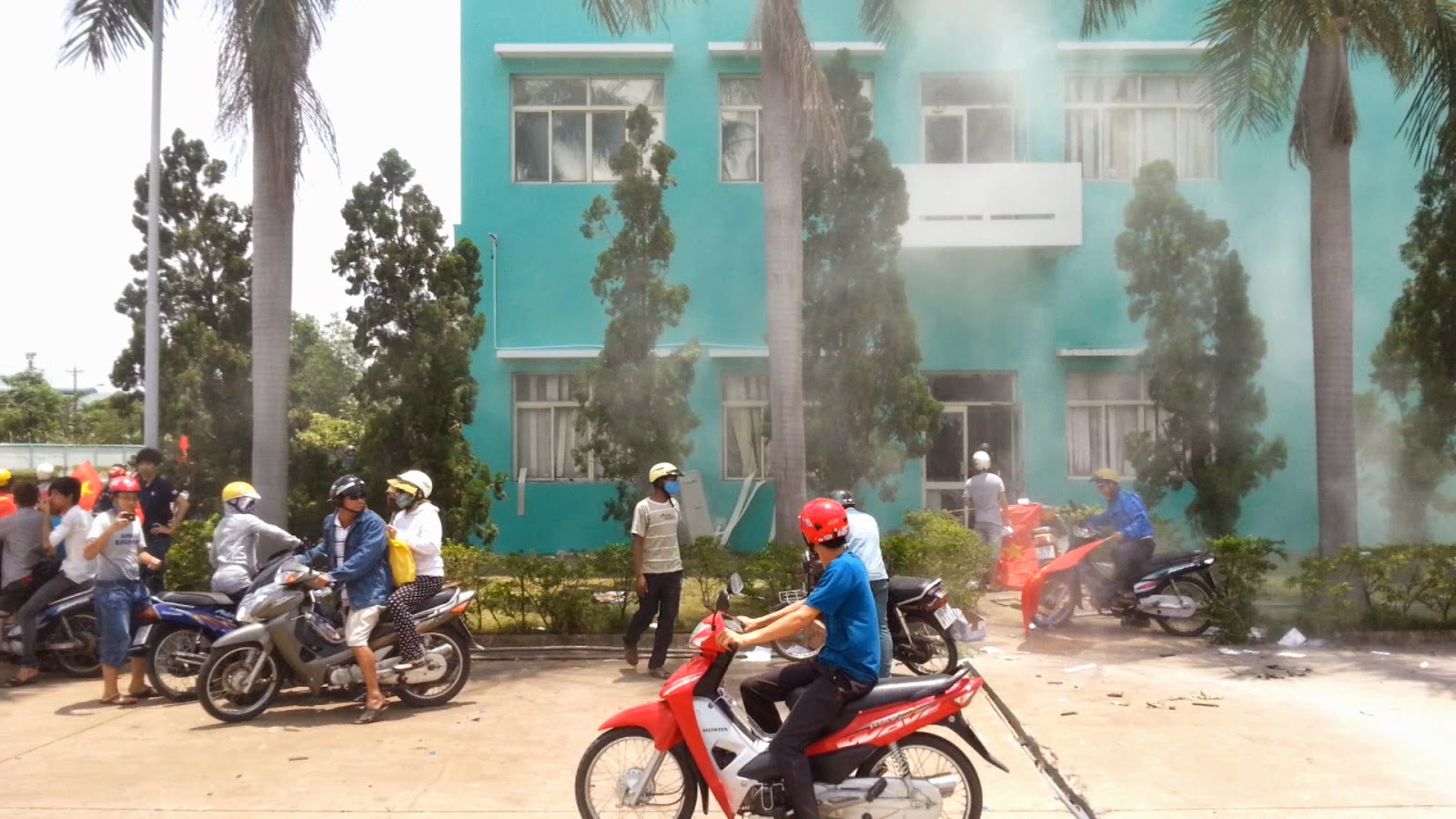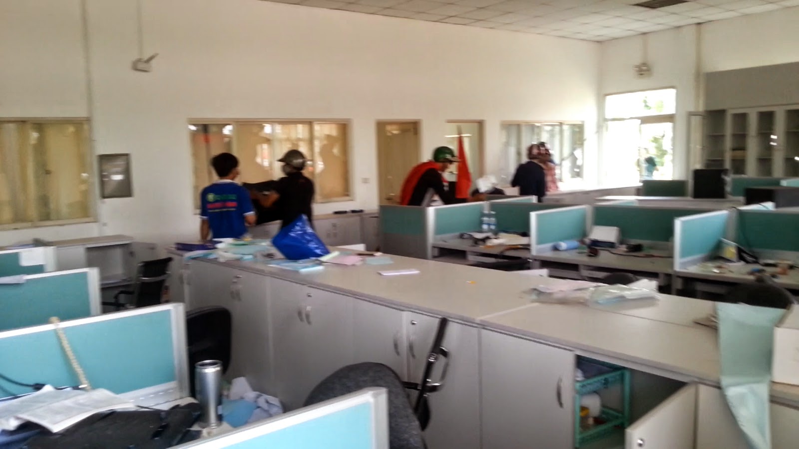 Ngay lập tức tức tiếng đổ vỡ vang lên. Ai đó sau lưng tôi ném một viên gạch lớn vào cửa kính tòa nhà. Linh tính như nhắc tôi nên vừa kịp né người qua, và nghe tiếng kính vỡ xoang xoảng. Tôi cầm máy chạy vào bên trong để ghi lại cảnh đập phá này. Cảnh tượng bên trong còn hãi hùng hơn. Tất cả mọi thứ bị đập nát. Kính vỡ và gãy đổ khắp mọi nơi. 2 thanh niên xông vào căn phòng trước đây có là nơi làm việc sổ sách và kéo liên tục các hộc tủ ra xem còn thứ gì có thể lấy được hay không. Cứ mỗi lần không tìm thấy, họ lại đập. Có một chi tiết tôi ngạc nhiên là chính những người cầm cờ đỏ ngoài kia, khi vào đến phòng này, khi thấy một lá cờ đỏ treo trên tường đã giật xuống. Họ là ai?