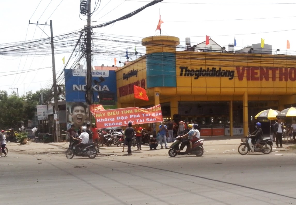 Đi thêm một đoạn nữa, chúng tôi bị lọt vào giữa một nhóm bạo động. Nhóm này có khoảng chừng 20, đến 30 người nòng cốt. Họ luôn chạy đầu, mang theo hung khí và hò hét để tập trung người. Các công ty mà chúng đi qua, gương mặt các nhân viên của công ty bảo vệ phái đến, rúm ró vì sợ hãi. Trước cánh cửa mọi công ty đều có treo băng-rôn: “Chúng tôi ủng hộ Việt Nam”, “Phản đối Trung Quốc”, “Tôi yêu Việt Nam”… Ai cũng biết, có thể đó là lời nói dối, nhưng lúc này, nói dối có thể cứu mạng và cứu tái sản của nhiều người. Tuy nhiên, cay đắng hơn là trước một vài cánh cổng đã bị lật đổ. Hàng rào bị phá… có cả băng-rôn “Đảng Cộng sản Việt Nam quang vinh”, “Việt Nam Muôn Nam”… bị vứt chỏng trơ dưới đất. Lá bùa hộ mạng cuối cùng cũng đã không còn hiệu nghiệm ở một vài nơi.