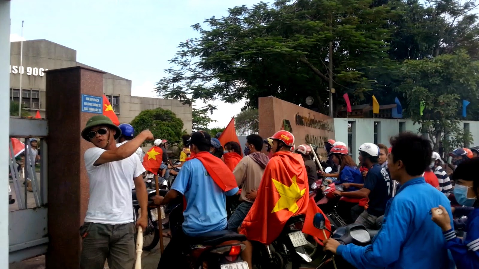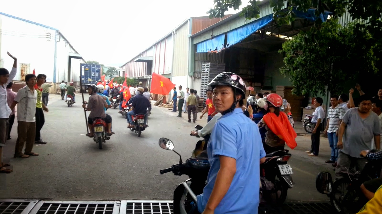 Một đám đông cầm cờ chạy vụt về phía khu công nghiệp Biên Hòa 2. Chúng tôi lại đi theo. Con đường dẫn vào khu công nghiệp này đang vắng, vì chưa đến giờ tan ca 1, cũng như rất ít công ty còn làm việc. Nơi này cũng không an ninh. Phía ngược chiều bên đường, một chiếc xe chạy cầm cờ, người ngồi sau mang ống tuýp nước bằng sắt dài, nhìn rất đáng ngại. Xe này chạy ào ạt vào trong nội khu công nghiệp. Nếu là ngày thường, chắc chắn chiếc xe đó đã bị CSGT chận lại. Nhưng hôm nay thì khác, họ chạy như trên xa lộ tự do.