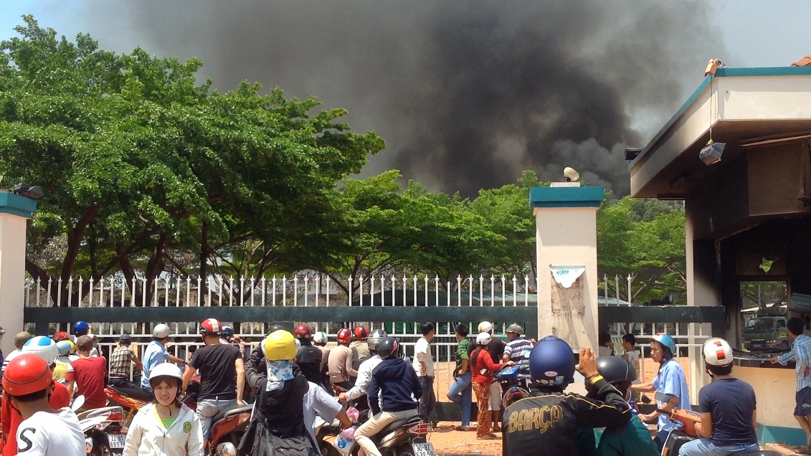Điều đó được xác định một lần nữa khi chúng tôi chạy đến một công ty Đài Loan khác, theo dấu một làn khói đen ngùn ngụt lên trời, có thể nhìn thấy rõ từ 2,3 cây số. Nơi này không còn rõ tên họ vì bảng hiệu đã bị đập. Chữ làm bằng ximăng và nhôm thì giờ chỉ còn là những mảnh vụn rải rác. Lửa vẫn còn cháy. Một tiểu đội CSCĐ có mặt nhưng đang ngồi nghỉ trong bóng mát, ăn cơm hộp. Không có dấu hiệu nào là xe chữa cháy sẽ đến. Một cô bán nước gần công ty cho biết lửa cháy từ cuộc bạo động lúc 5,6 giờ sáng cho đến giờ, không ai dập cả, toàn bộ ban giám đốc đã đi trốn. Điều lạ là giữa những người bàng quan, có một 1,2 nhân vật ăn mặc không là công nhân đứng gần đó, mặt rất khó chịu khi chúng tôi hỏi thăm và chụp hình. Thậm chí nếu chúng tôi không nhanh chóng rời khỏi nơi đó, có thể sẽ gặp rắc rối.