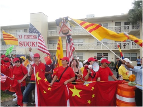 Hơn 11 giờ trưa, ông Nguyễn Văn Tánh, điều hợp chương trình biểu tình, và đồng hương các nơi tới, ông Tánh và Bác Sĩ Võ Đình Hữu, Chủ Tịch Cộng Đồng Liên Bang Hoa Kỳ, gọi đoàn Atlanta trở ra địa điểm công viên, phối họp cùng với các đoàn khác, lúc này đồng hương chưa đông mới hơn ba trăm người. Vừa tới mục tiêu chưa kịp thở, Vạn An Thạch (ở Orlando) cho biết mới xô xát với tụi Trung Cộng, ở đằng kia, nhìn theo tay Thạch chỉ, một nhóm Trung Cộng, chừng 30 người, mặc đồng phục áo đỏ, in 1 sao vàng lớn, 4 sao nhỏ, họ mang theo khẩu hiệu “Welcome Xi Jinping” và cờ Trung Cộng.
