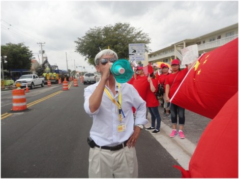 Người viết bài này, dùng loa pin, hô những khẩu hiệu trên, (xem hình) phía Trung Cộng có 2 đợt tăng người, mỗi đợt họ thêm chừng vài chục người, càng về trưa số đồng hương càng đông hơn, đã cắt đoàn Trung Cộng ra làm 3 khúc, nhờ họ mặc đồng phục nên dễ quan sát, họ tản đến đâu cờ VNCH vây bọc tới đó. Cuối cùng từng nhóm Trung Cộng âm thầm, lặng lẽ rời vị trí, trước khi xe TT Donald Trump đi qua khoảng 30 phút, trên đường phố chỉ còn một màu cờ VNCH.